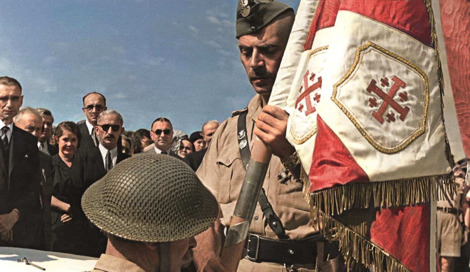 Gen. Władysław Anders ze sztandarem 5. Dywizji Piechoty 2 Korpusu Polskiego, Palestynia, 1943 r. (fot. Instytut Polski i Muzeum im. gen. Sikorskiego w Londynie)